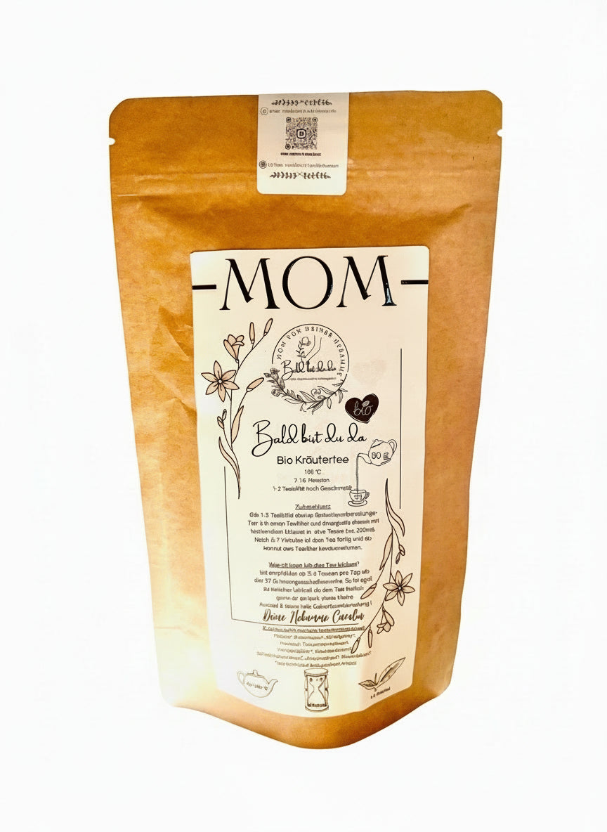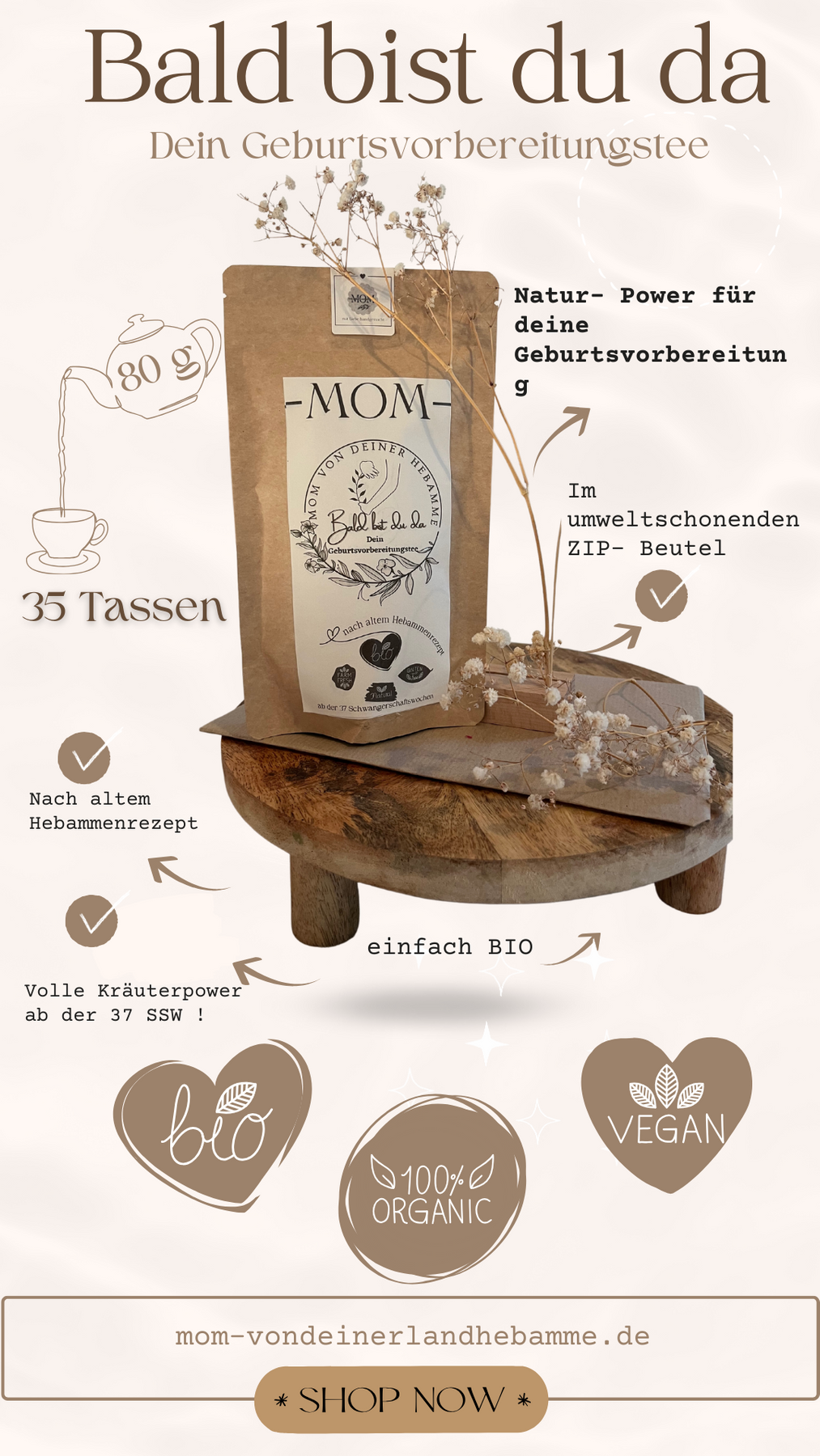 „Bald bist du da“ ist ein liebevoll abgestimmter Bio-Kräutertee, entwickelt nach meiner traditionellen Hebammenrezeptur und in einer kleinen Hamburger Manufaktur schonend von Hand gemischt.
