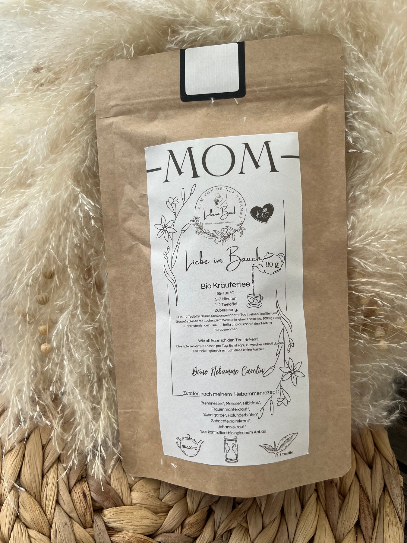 „Liebe im Bauch“ wurde nach meinem alten Hebammenrezept kreiert und in einer kleinen Hamburger Teemanufaktur schonend von Hand gemischt – natürlich 100 % Bio, ohne Zusätze, ohne Gedöns.